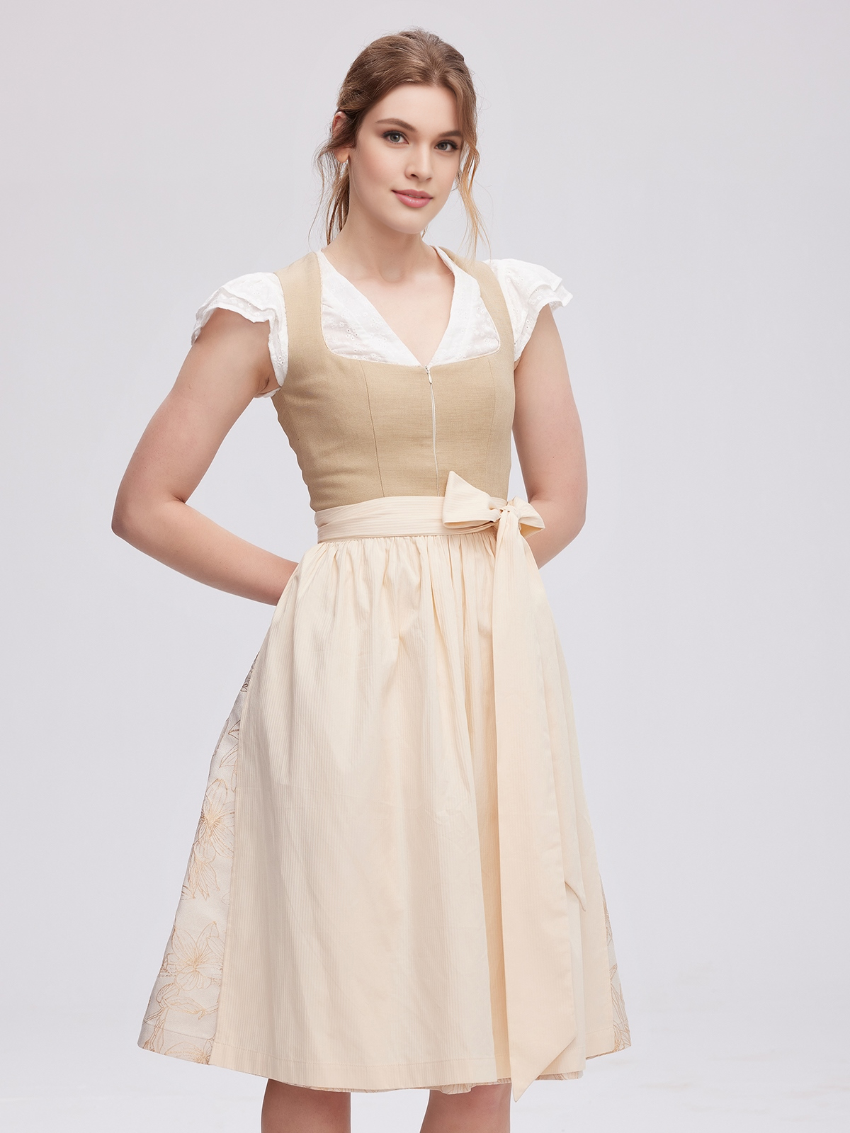 Ein braunes Dirndl (wie auf diesem Bild) strahlt Wärme und Natürlichkeit aus. Es wird oft von Frauen getragen, die Wert auf zeitlose Eleganz legen.
